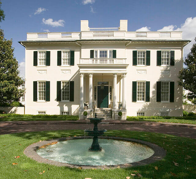 As imponentes entradas frontais com grandes painéis e acentuadas com um frontão que repousa sobre pilastras é um dos elementos mais comuns a todas as casas coloniais. Algumas até têm um frontão estendido para frente em colunas que servem como um alpendre coberto.