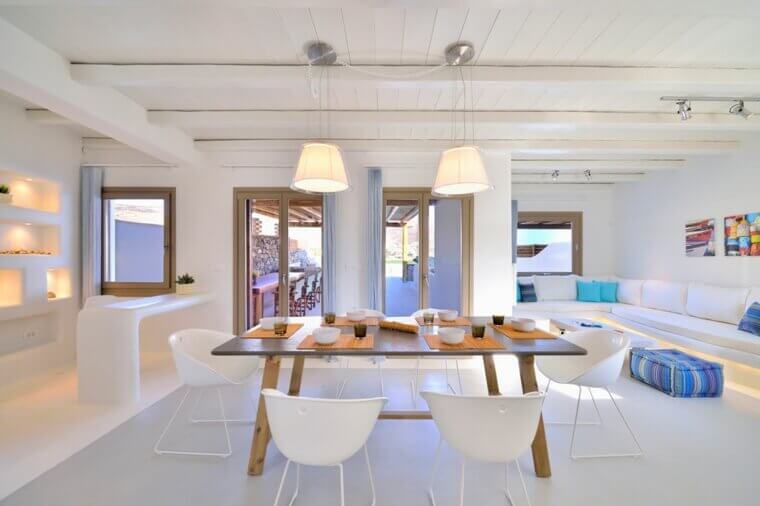 As características dos interiores das casas mediterrâneas também definem o estilo. São casas de um ou dois andares, sendo a planta retangular. O design dessas casas permite que a brisa flua através delas, e fazem uso intensivo da madeira nos interiores.
